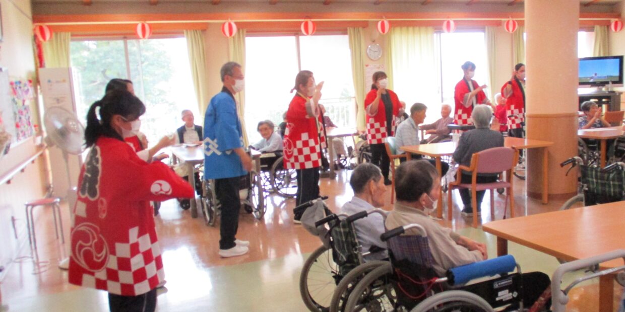 2025年8月 納涼祭 by 黒澤幸十郎 Posted on 2025年11月14日2025年11月14日 特養ホーム 園内が提灯やうちわなどの飾りつけでお祭りムードの中、恒例の納涼祭が行われました。 職員による岡部音頭や秩父音頭も披露され、皆さんお祭りを楽しみました。